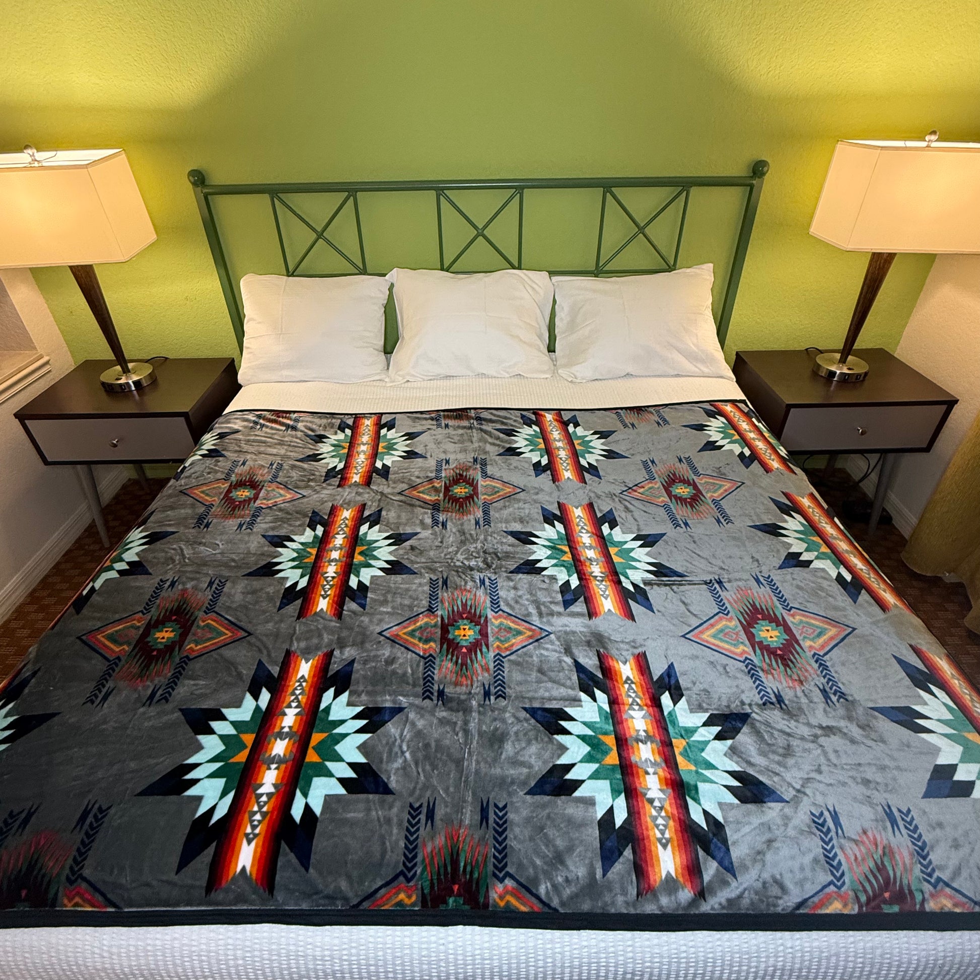 Elevate your space with this striking Native Geometric Star Blanket, crafted from luxuriously soft velvet plush. Available in Full/Twin dimensions, this double-sided design offers versatile styling - showcase the rich grey on one side or flip to the sophisticated black reverse for an instant aesthetic shift. Perfect for layering on beds, draping across furniture, or displaying as meaningful décor, this blanket combines cultural artistry with everyday comfort and functionality.