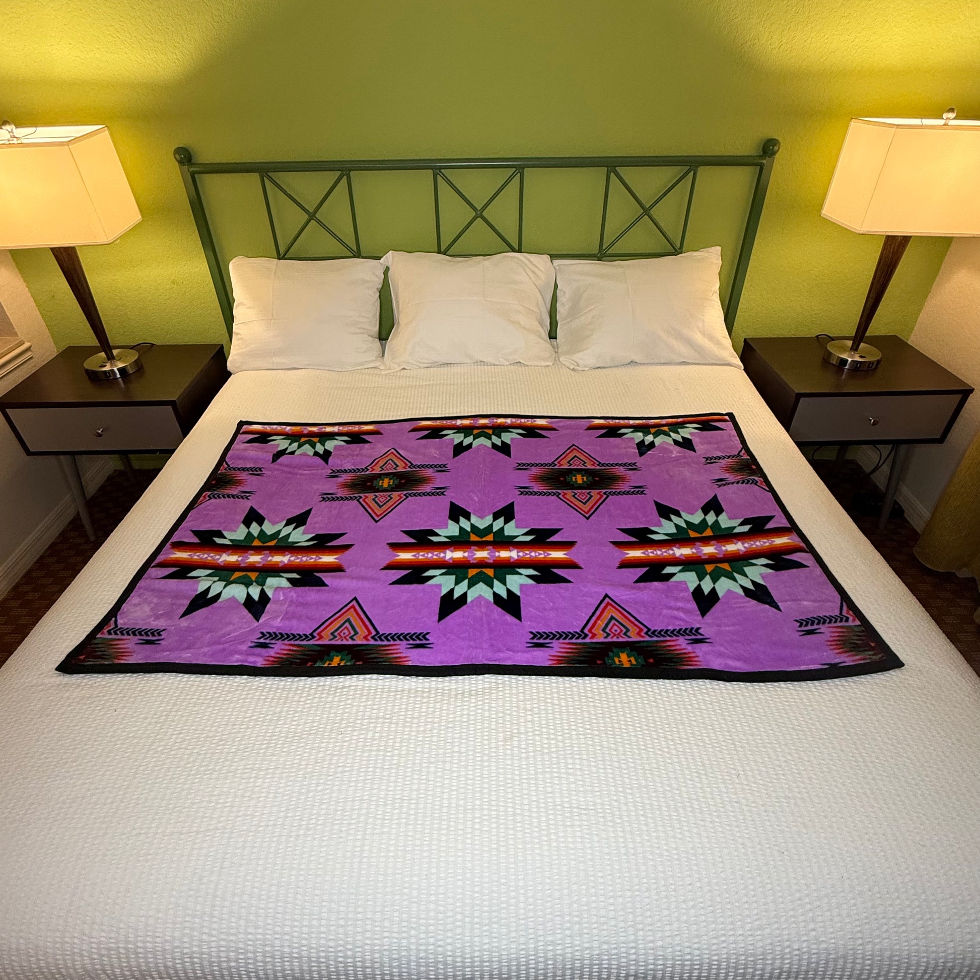 Embrace Native artistic traditions with this Geometric Star Baby Throw, expertly crafted from luxurious velvet plush. The reversible design features lucious lavender on one side and refined black on the other, providing versatile styling to match any décor. Perfectly scaled as a baby throw, it works beautifully for crib layering, stroller draping, or wall display. Authentic geometric patterns honor Native craftsmanship while delivering exceptional softness and durability. A meaningful choice that combines cultural appreciation with everyday comfort and practicality for your family.