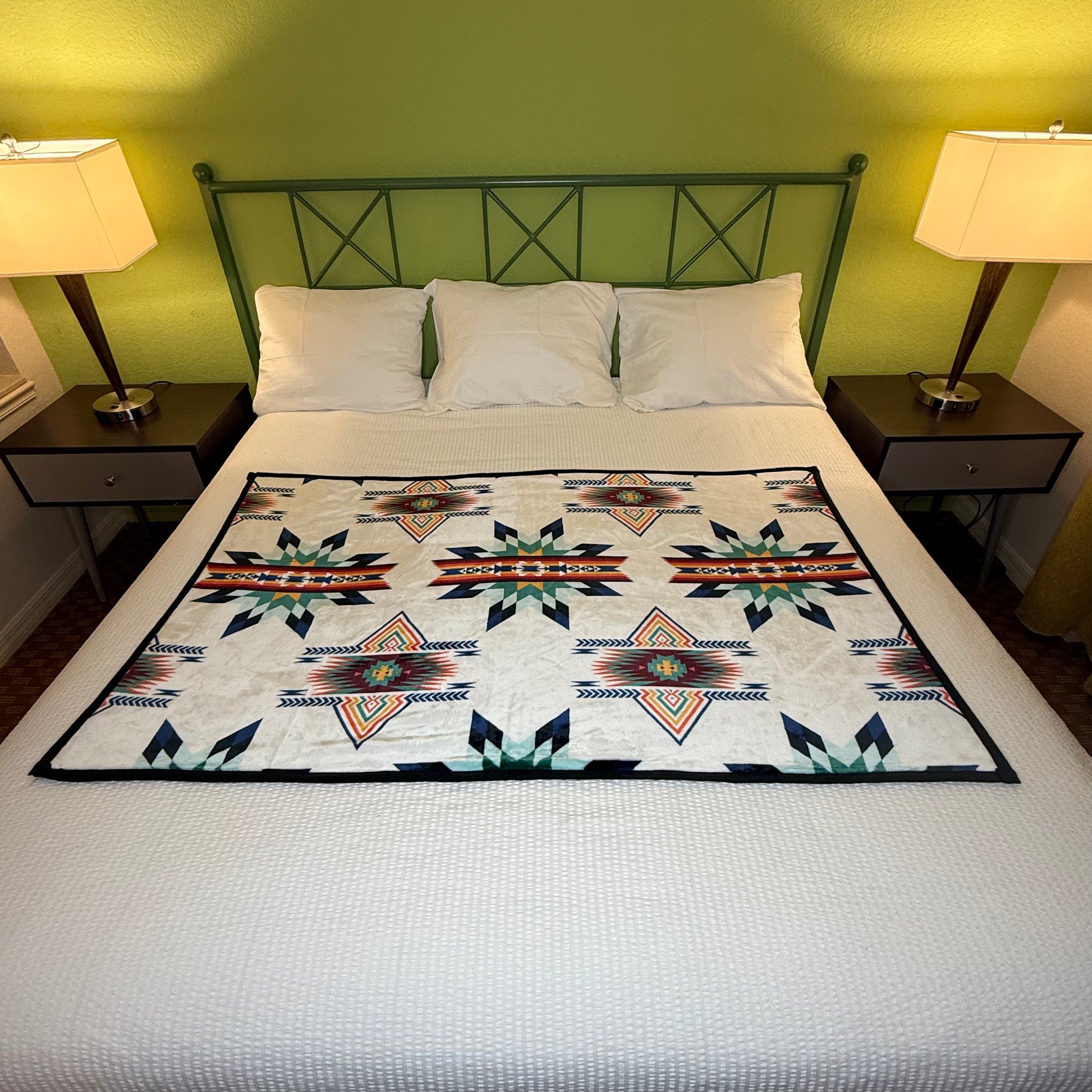 Embrace Native artistic traditions with this Geometric Star Baby Throw, expertly crafted from luxurious velvet plush. The reversible design features white on one side and refined mint on the other, providing versatile styling to match any décor. Perfectly scaled as a baby throw, it works beautifully for crib layering, stroller draping, or wall display. Authentic geometric patterns honor Native craftsmanship while delivering exceptional softness and durability. A meaningful choice that combines cultural appreciation with everyday comfort and practicality for your family.