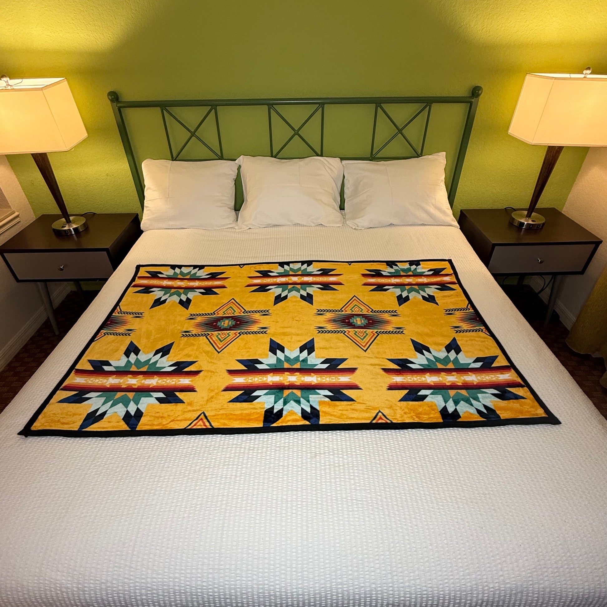 Embrace Native artistic traditions with this Geometric Star Baby Throw, expertly crafted from luxurious velvet plush. The reversible design features yellow on one side and refined black on the other, providing versatile styling to match any décor. Perfectly scaled as a baby throw, it works beautifully for crib layering, stroller draping, or wall display. Authentic geometric patterns honor Native craftsmanship while delivering exceptional softness and durability. A meaningful choice that combines cultural appreciation with everyday comfort and practicality for your family.